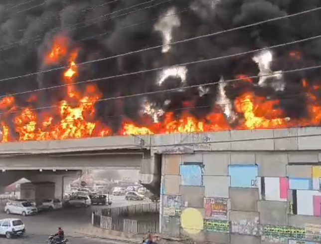 फ्लाईओवर पर तेल से भरे टैंकर में लगी भीषण आग