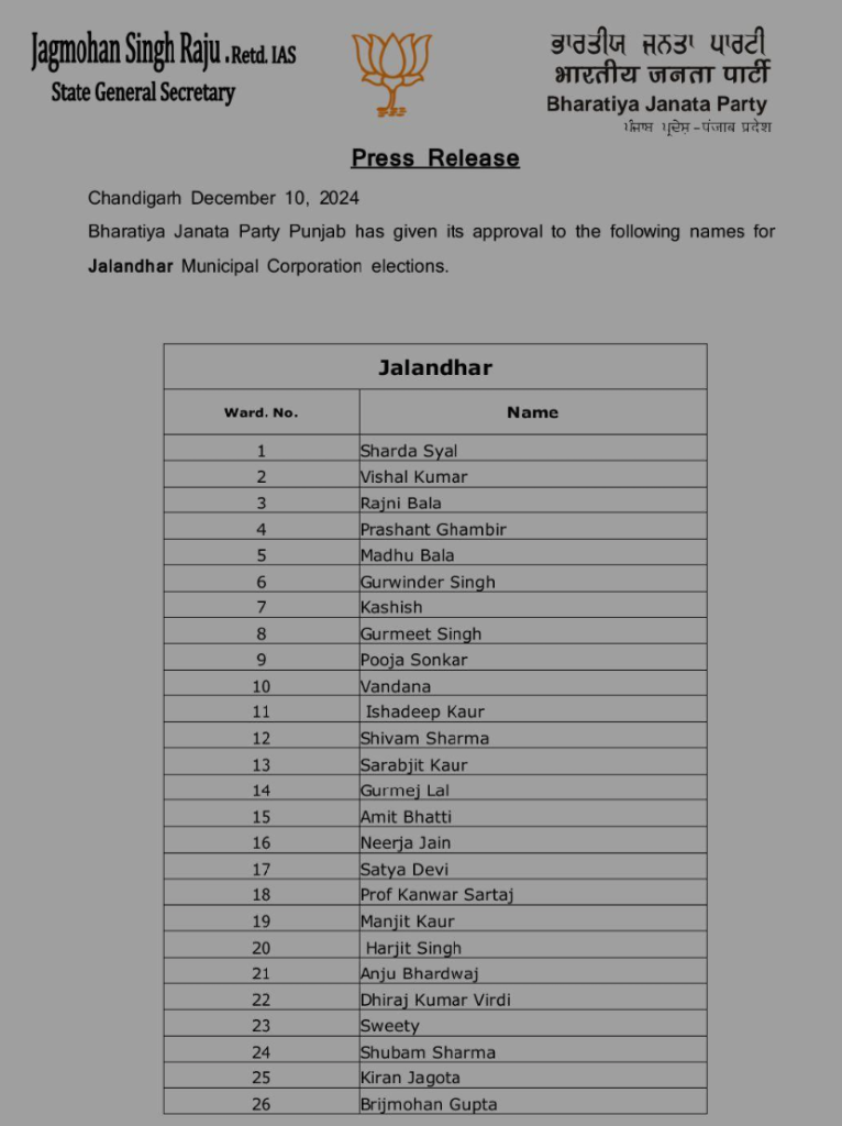 admin December 11, 2024December 11, 2024 Jalandhar, Political भाजपा ने जारी की नगर निगम चुनाव के उम्मीदवारों की लिस्ट
