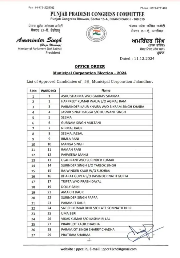 admin December 12, 2024December 12, 2024 Jalandhar, Political जालंधर : कांग्रेस ने जारी की उम्मीदवारों की लिस्ट