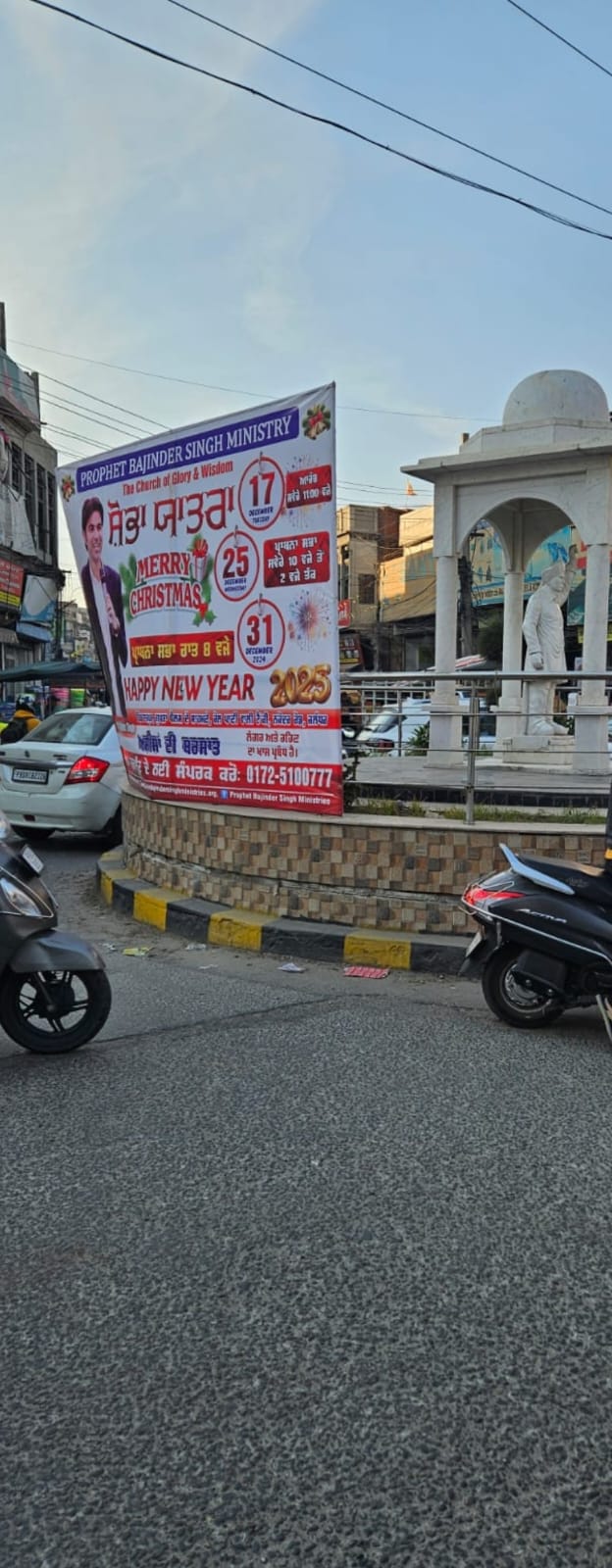 Punjab ujala news : जालंधर- शहीद ए आजम भगत सिंह की शहादत को हर कोई नमन करता है और उनकी याद में ही जालंधर में शहीद भगत सिंह चाैक बनाया गया है। यहां पर शहीद ए आजम की प्रतिमा लगी है जोकि यहां से गुजरने वाले लोगों को दिखाई देती है। लेकिन आज चाैक के दो तरफ से आने वाले रास्ते फगवाड़ा गेट और प्रताप बाग की तरफ से ये प्रतिमा नजर नहीं आ रही। इसकी वजह यह है कि 17 दिसंबर को प्रोफैट बरजिंदर सिंह मिनिस्ट्री की तरफ से निकाली जाने वाली शोभायात्रा का बोर्ड चाैक में लगा दिया गया है। इस कारण बोर्ड इस तरफ से दिख नहीं रहा। यह शोभायात्रा क्रिसमस के उपलक्ष्य में निकाली जा रही है। इस बोर्ड को लेकर हिन्दू संगठनों ने विरोध जताना शुरू कर दिया है।