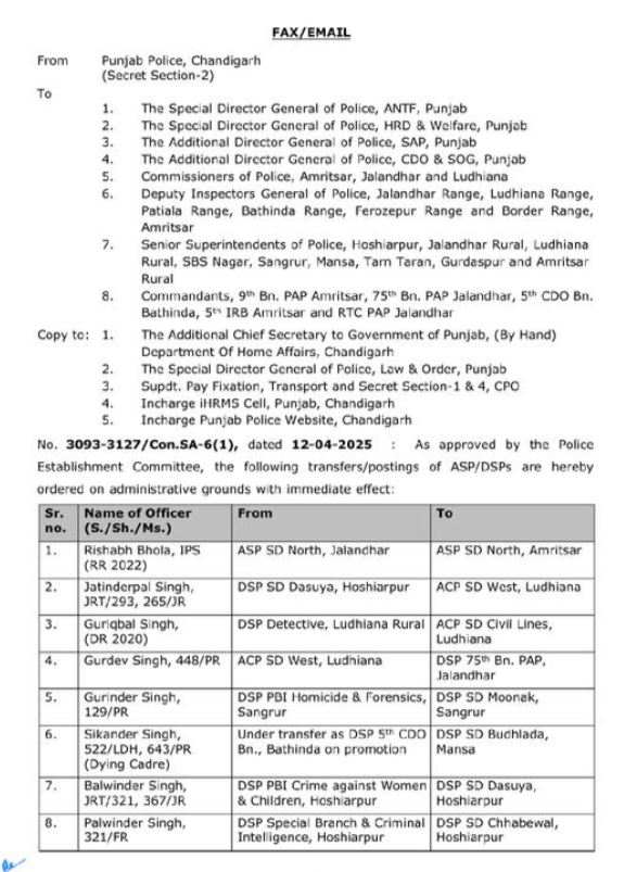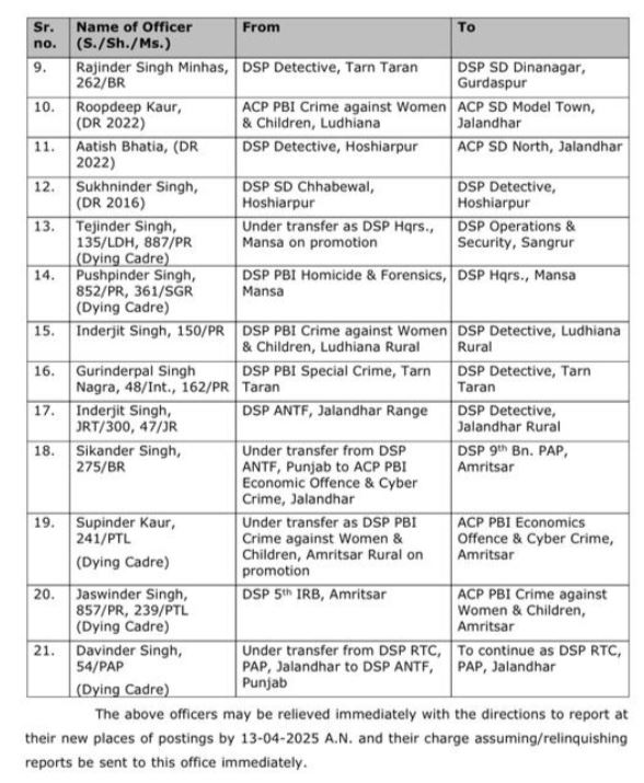 पंजाब सरकार की तरफ से तबादलों का दौर लगातार जारी है। इसी कड़ी के तहत आज पुलिस प्रशासन में बड़ा फेरबदल करते हुए जालंधर-लुधियाना के ए.सी.पी. व डी.एस.पी. सहित 21 पुलिस अधिकारियों का तबादला कर दिया गया है। अतः जिन अधिकारियों की आज ट्रांसफर की गई है, उनके नामों की लिस्ट निम्न है।