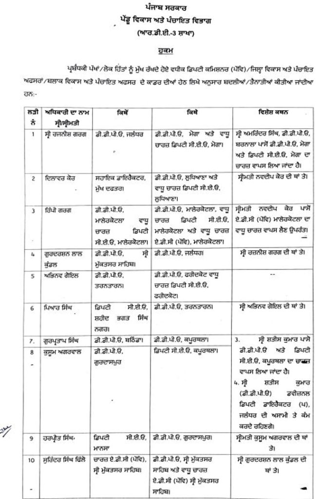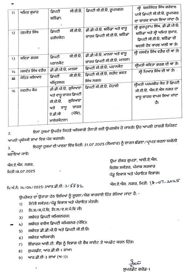 Punjab ujala news : पंजाब सरकार के ग्रामीण विकास एवं पंचायत विभाग द्वारा डी.डी.पी.ओ., सहायक डायरेक्टर और सी.ई.ओ. के तबादले किए गए हैं। विभाग की ओर से जारी पत्र में 21 जुलाई को ही चार्ज छोड़ने और संभालने के निर्देश दिए गए हैं। पत्र में यह भी स्पष्ट किया गया है कि ये आदेश तत्काल प्रभाव से लागू माने जाएंगे। तबादलों की पूरी सूची आप नीचे दी गई खबर में देख सकते हैं।