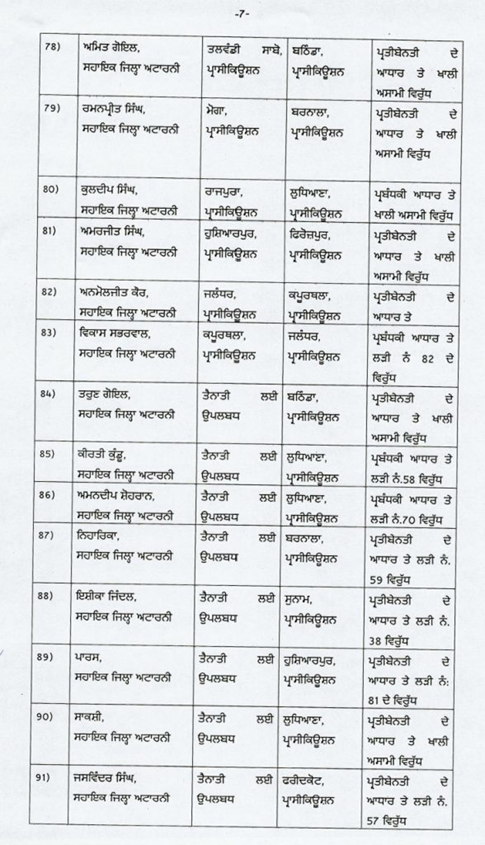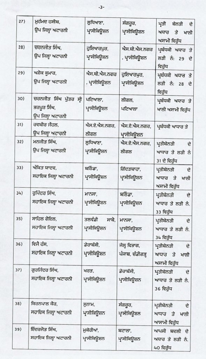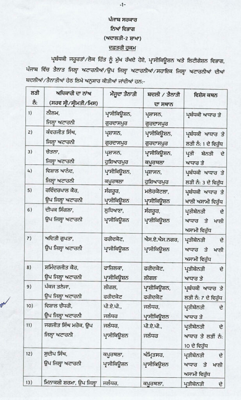 punjab ujala news ; पंजाब सरकार के न्याय विभाग ने प्रशासनिक और जनहित को ध्यान में रखते हुए प्रॉसिक्यूशन और लिटिगेशन विभाग, पंजाब में तैनात जिला अटॉर्नी, उप जिला अटॉर्नी और सहायक जिला अटॉर्नियों के बड़े पैमाने पर तबादले किए हैं। पंजाब सरकार द्वारा जारी नोटिफिकेशन के मुताबिक, प्रदेशभर में कुल 96 तबादले किए गए हैं। तबादलों की पूरी सूची इस प्रकार हैः-