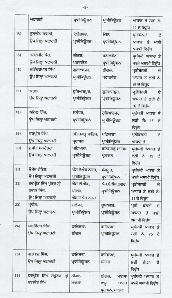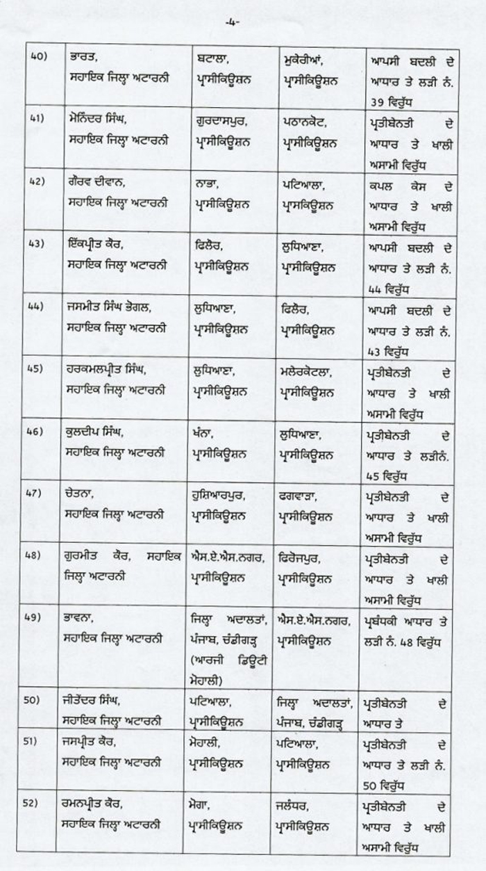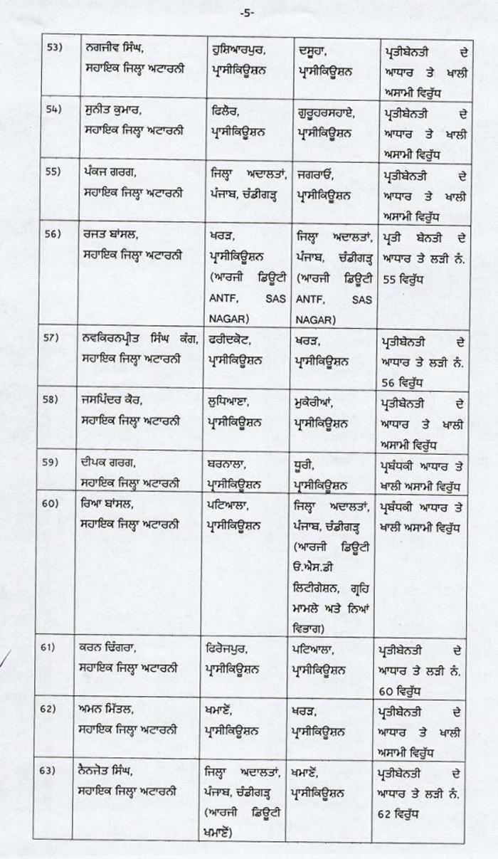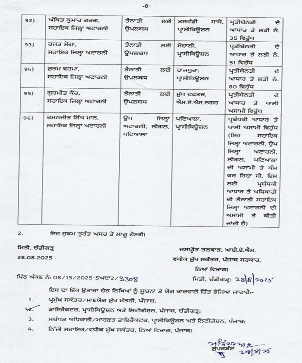 punjab ujala news ; पंजाब सरकार के न्याय विभाग ने प्रशासनिक और जनहित को ध्यान में रखते हुए प्रॉसिक्यूशन और लिटिगेशन विभाग, पंजाब में तैनात जिला अटॉर्नी, उप जिला अटॉर्नी और सहायक जिला अटॉर्नियों के बड़े पैमाने पर तबादले किए हैं। पंजाब सरकार द्वारा जारी नोटिफिकेशन के मुताबिक, प्रदेशभर में कुल 96 तबादले किए गए हैं। तबादलों की पूरी सूची इस प्रकार हैः-