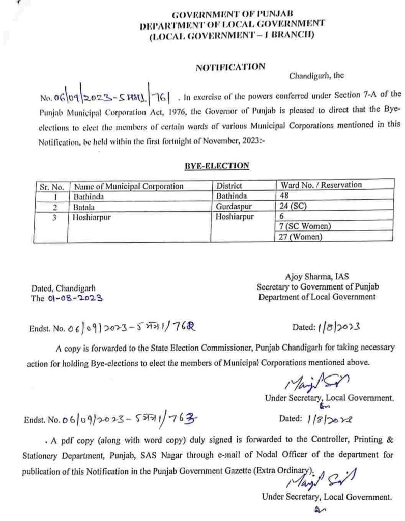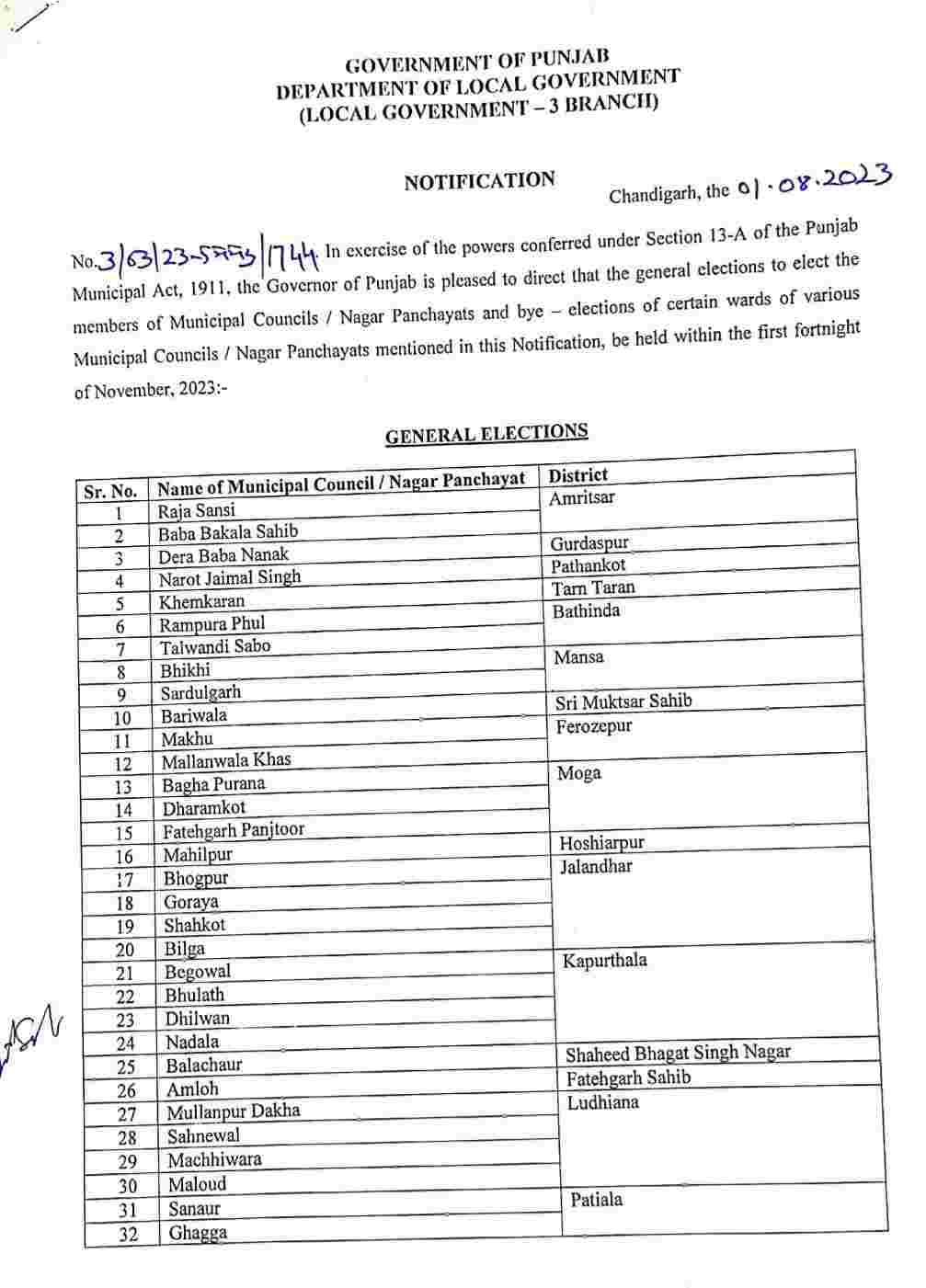 जालंधर, पंजाब में नगर कौंसिल व नगर पंचायतों के चुनावों का बिगुल बज गया है। जारी हुुए नोटिफिकेशन के अनुसार चुनाव 1 से 15 नवंबर के बीच होंगे। बता दें कि जिला जालंधर में गोराया, भोगपुर, बिलगा, शाहकोट, कपूरथला में बागोवाल, भुलत्थ, ढिल्लवां, नडाला और लुधियाना में मुल्लांपुर दाखा, साहनेवाल, माछीवाड़ा, मलोट में नगर परिषद के चुनाव होने हैं। इसी तरह, बठिंडा, अमृतसर, तरनतारन, गुरदासपुर, फतेहगढ़ साहिब, फिरोजपुर, फरीदकोट, पटियाला, संगरूर, मालेरकोटला, एसएएस नगर,पटियाला में उपचुनाव होंगे।