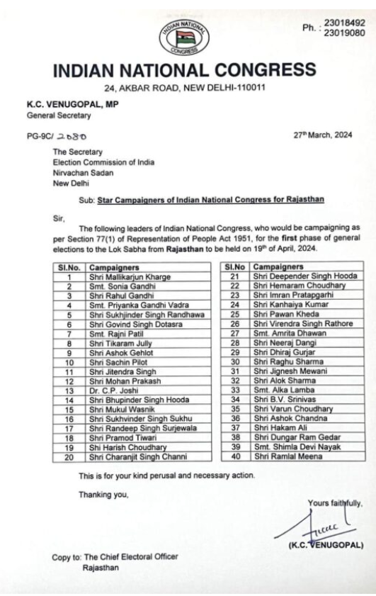 लोकसभा चुनाव के लिए कांग्रेस ने स्टार प्रचारकों की लिस्ट की जारी