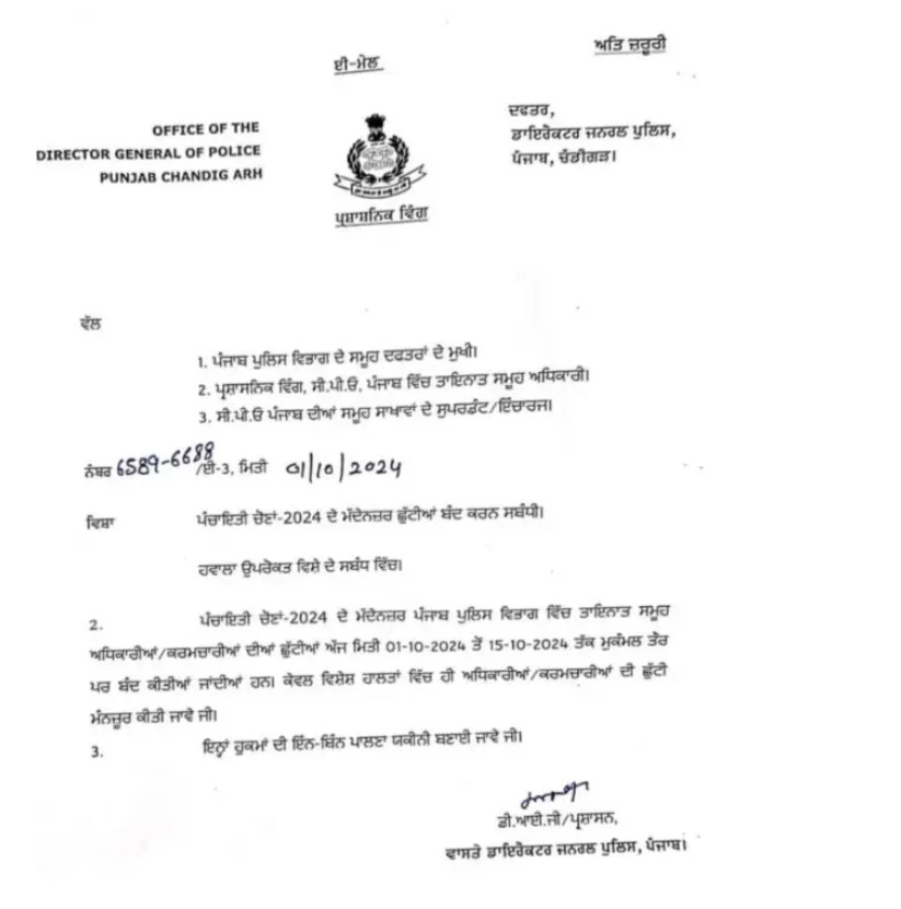 Punjab ujala news : पंजाब में होने जा रहे पंचायत चुनाव-2024 के मद्देनजर देखते हुए पंजाब पुलिस के सभी विभागों में छुट्टियां रद्द कर दी गई हैं। इस संबंध में पंजाब के डीजीपी गौरव यादव ने पत्र लिखकर जारी किया है।डीजीपी की ओर से जारी पत्र के मुताबिक कहा गया कि पंजाब पुलिस के अधिकारियों और कर्मचारियों की छुट्टियां 1 अक्टूबर से 15 अक्टूबर तक पूरी तरह से रद्द कर दी गई हैं। इसके साथ ही यदि किसी पुलिस कर्मी को एमरजेंसी छुट्टी चाहिये तो उसके लिये विशेष आवेदन देना अनिवार्य होगा।