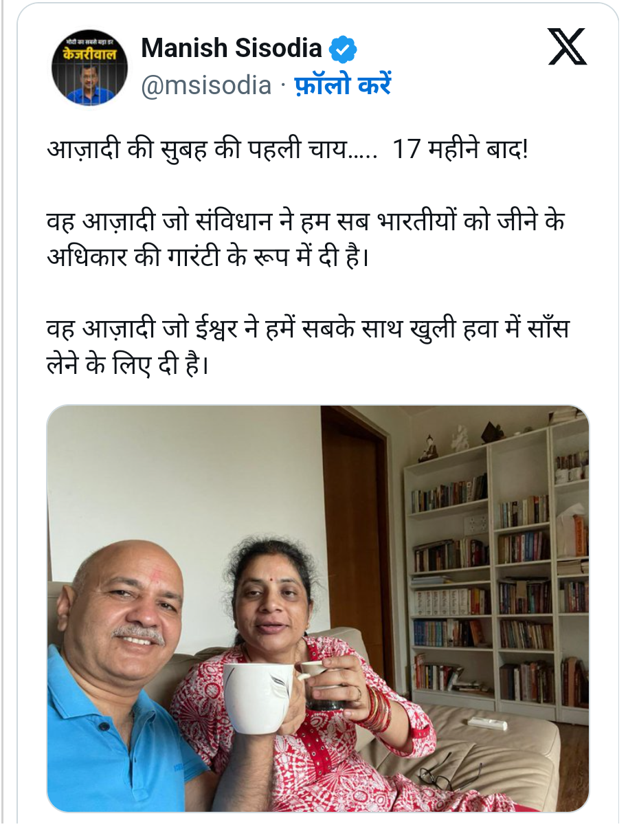 Punjab ujala news : दिल्ली की तिहाड़ जेल से दिल्ली के पूर्व उपमुख्यमंत्री मनीष सिसोदिया बीती रात बाहर आए। उसके बाद आज सुबह उन्होंने अपने एक्स अकाउंट पर भावुक पोस्ट लिखी। इसमें उन्होंने पत्नी के साथ चाय पीते हुए की फोटो भी शेयर की। मनीष सिसोदिया 17 महीनों बाद जेल [...]