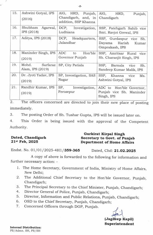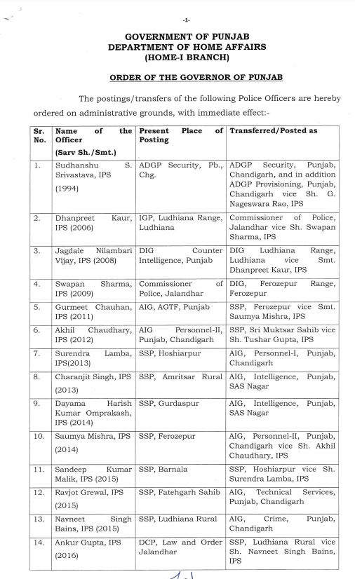 जालंधर पुलिस कमिश्नर सहित 21 IPS अधिकारियों के तबादले