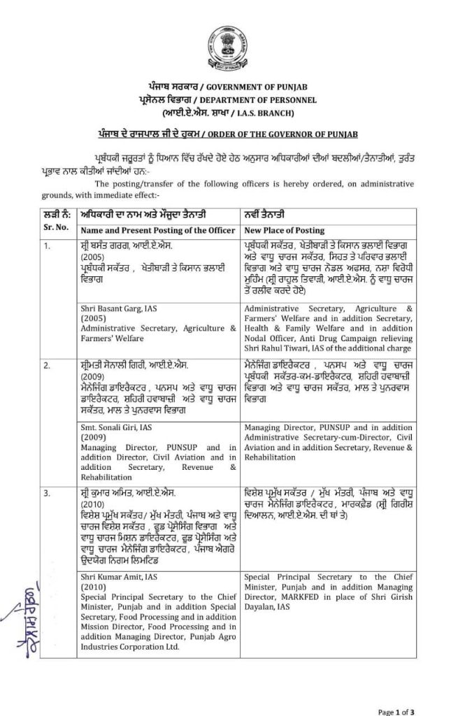 Punjab : IAS सहित 7 अधिकारियों के तबादले
