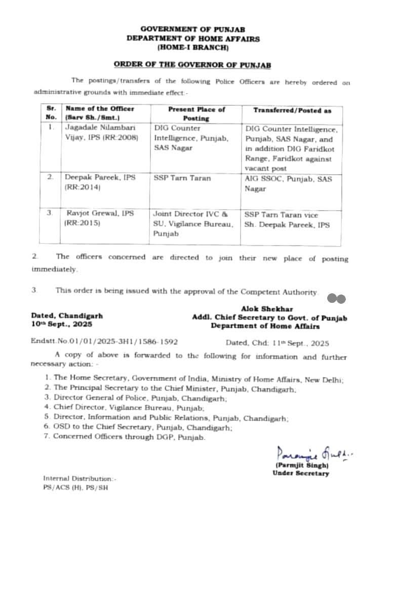 PUNJAB UJALA NEWS : पंजाब सरकार ने IPS अधिकारियों के तबादले किए हैं। इसमें तरनतारन के SSP आईपीएस दीपक पारीक का तबादला कर दिया गया है। अब 2015 बैच के आईपीएस अधिकारी रवजोत ग्रेवाल तरनतारन जिले के नए एसएसपी होंगे।वहीं, IPS दीपक पारीक (2014 बैच) को तरनतारन से स्थानांतरित कर एसएएस नगर नियुक्त किया गया है। इसके अलावा, IPS जगदले नीलांबरी विजय (2008 बैच) को उनके वर्तमान पद पर बने रहते हुए डीआईजी काउंटर इंटेलिजेंस, पंजाब, एसएएस नगर का अतिरिक्त कार्यभार सौंपा गया है।