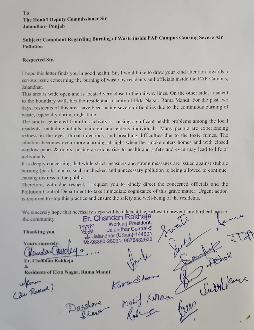Punjab ujala news,जालंधर: एक गंभीर जन-स्वास्थ्य मुद्दे को लेकर आज भाजपा के तेजतर्रार नेता ईंजी रखेजा द्वारा इलाका निवासियों के साथ पहुंचकर जालंधर के डिप्टी कमिश्नर वरजीत वालिया जी को एक लिखित शिकायत सौंपी गई, जिसमें PAP कैंपस के अंदर निवासियों एवं अधिकारियों द्वारा लगातार कूड़ा जलाए जाने से फैल रहे प्रदूषण पर तत्काल कार्रवाई की मांग की गई है। शिकायत में बताया गया कि PAP कैंपस का क्षेत्र खुला होने के साथ-साथ रेलवे लाइनों के बेहद नजदीक स्थित है। वहीं दूसरी ओर इसकी सीमा दीवार के साथ सटे एकता नगर, रामामंडी जैसे रिहायशी इलाके हैं, जहां के निवासी पिछले कई दिनों से कूड़ा जलाने के कारण भारी परेशानी झेल रहे हैं। विशेष रूप से रात के समय जलाए जा रहे कचरे का धुआं घरों के अंदर तक पहुंच रहा है, जिससे छोटे बच्चों, बुजुर्गों और आम नागरिकों को आंखों में जलन, गले में संक्रमण और सांस लेने में दिक्कत जैसी गंभीर स्वास्थ्य समस्याएं हो रही हैं और एकता नगर में एन.आर.आई निवासी को आ.सी.यू तक में भर्ती करवाना पड़ा है। शिकायत में यह भी उल्लेख किया गया कि जहां एक ओर पराली जलाने के खिलाफ सख्त निर्देश और जागरूकता अभियान चलाए जा रहे हैं, वहीं दूसरी ओर इस तरह का अनियंत्रित और अनावश्यक कूड़ा जलाना प्रशासन की अनदेखी को दर्शाता है, जिससे आम जनता में रोष व्याप्त है।