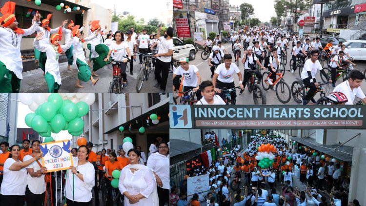 जालंधर, बौरी मेमोरियल एजुकेशनल एंड मेडिकल ट्रस्ट के तत्वाधान में चलाए जा रहे ‘दिशा- एक इनीशिएटिव’ के अंतर्गत इनोसेंट हार्ट्स ग्रुप के स्टाफ, विद्यार्थियों तथा अभिभावकों ने आजा़दी का अमृत महोत्सव मनाते हुए इनोसेंट हार्ट्स ग्रीन मॉडल टाऊन से जालंधर शहर में विद्यालय की स्टूडेंट काउंसिल द्वारा साइक्लोथाॅन का आयोजन किया गया, जिसमें उन्होंने विशाल साइकिल रैली निकालकर ‘मेरी माटी, मेरा देश’ के अंतर्गत अपने देश की माटी का सम्मान करने, उसकी रक्षा के लिए हर वक्त तैयार रहने और इसके साथ-साथ अपने पर्यावरण की रक्षा करने का संदेश दिया।