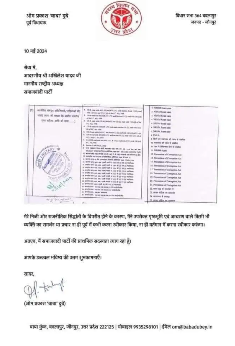 Punjab ujala news : लोकसभा चुनाव 2024 के चौथे फेज की वोटिंग से पहले उत्तर प्रदेश में समाजवादी पार्टी और अखिलेश यादव को झटका लगा है। पार्टी के पूर्व विधायक ओम प्रकाश दुबे उर्फ बाबा ने पार्टी से इस्तीफा दे दिया है। उनका त्यागपत्र सोशल मीडिया में वायरल हो रहा है। ओम जौनपुर जिले के बदलापुर से 2012 में समाजवादी पार्टी से विधायक रहे हैं 2017 और 2022 में भी समाजवादी पार्टी से बदलापुर विधानसभा से उन्होंने चुनाव लड़े थे।